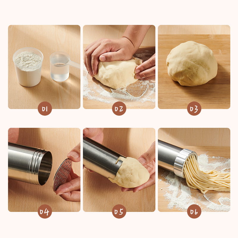 ERGONOMISK HÅNDBETJENING: Med sin kompakte, lette design og grepsvennlige håndtak er denne pastamaskinen en lek å bruke, noe som gjør den enkel å manøvrere og kontrollere under ekstruderingsprosessen. Perfekte nudler kan enkelt lages uten kompliserte operasjoner og kjedelig manuelt arbeid.