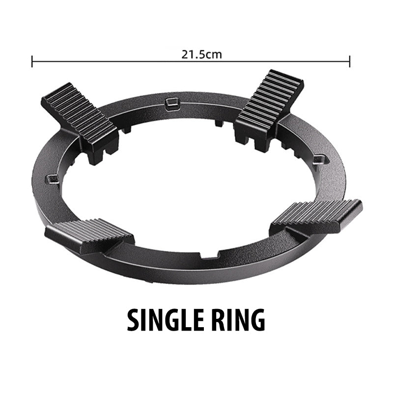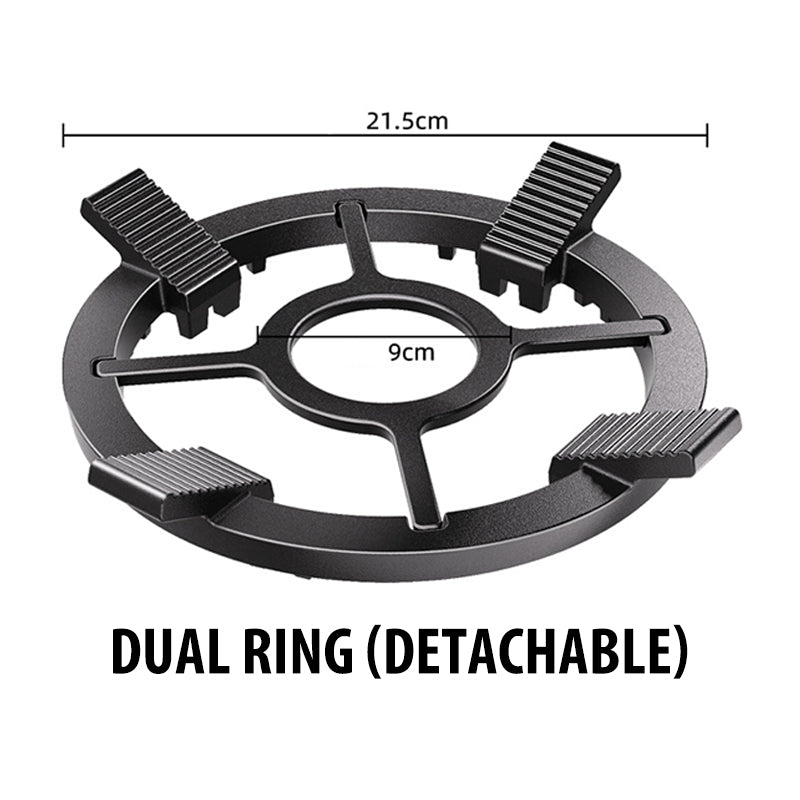 AVTAKBAR INNERSIRKEL: Stativet har en avtakbar indre sirkel som kan justeres for å passe til mindre gryter, noe som sikrer stabilitet under tilberedningen. Denne to-i-ett-designen gir mulighet for allsidig bruk. Med vinklede hjørner som tilpasser seg gryteformene, maksimerer den kontakten for jevn varmefordeling, noe som gjør den perfekt for både rundt og spissbunns kokekar.